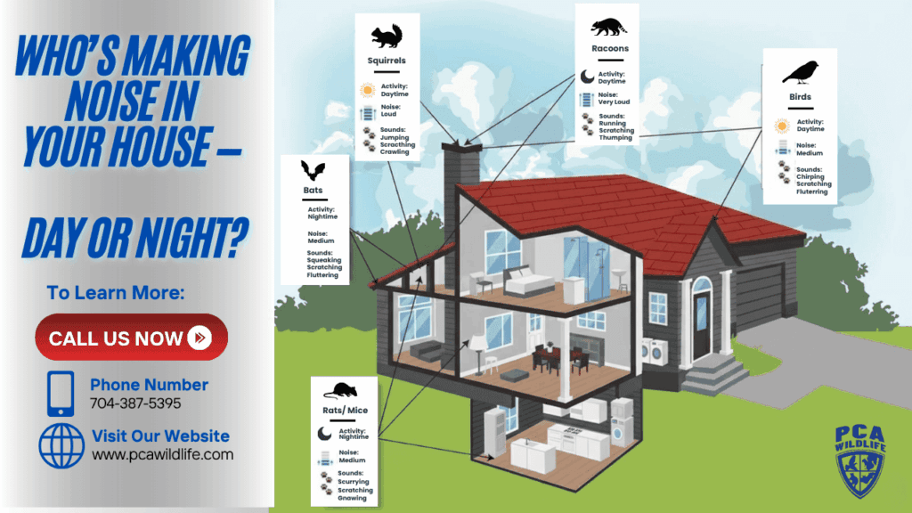 At PCA Wildlife, we help homeowners across Charlotte, NC, identify and remove wildlife safely and humanely. Knowing whether the sounds happen at night or during the day is one of the biggest clues in solving the problem.